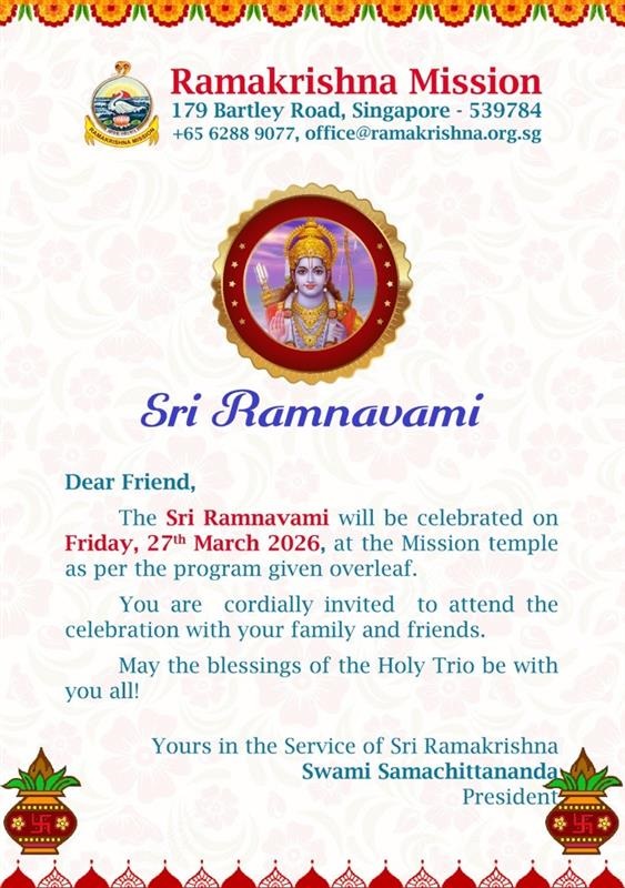 The Sri Ramnavami will be celebrated on Friday, 27 March 2026, at the Mission temple as per the program given overleaf.